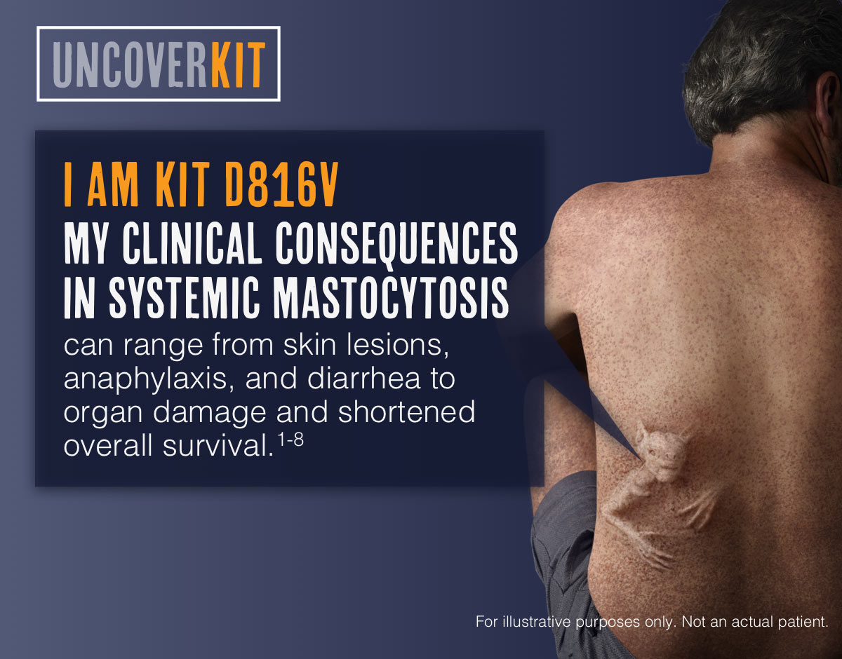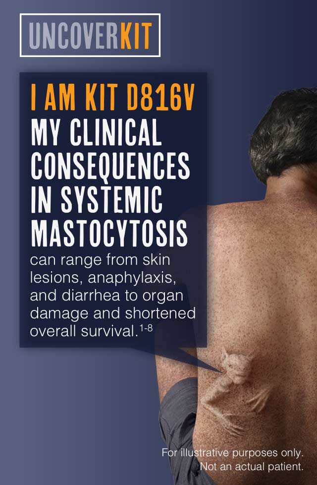 Patients often present with 2 or more seemingly unrelated symptoms that may be driven by the KIT D816V mutation. The KIT D816V mutation is the central driver of systemic mastocytosis in ~95% of cases.1,3,9-11